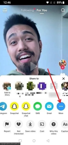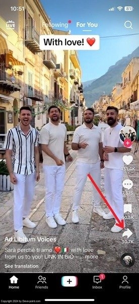 افتح تطبيق TikTok، وقم بتسجيل الدخول إلى حسابك إذا لم تقم بذلك بالفعل. ابحث عن مقطع فيديو في الموجز الذي تريد تنزيله، ثم اضغط على يشارك الزر الموجود على الجانب الأيمن من الشاشة.