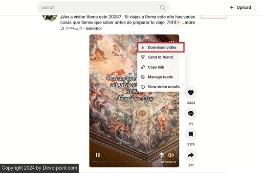 افتح TikTok في متصفحك المفضل، وانتقل إلى الفيديو الذي ترغب في تنزيله. انقر بزر الماوس الأيمن على الفيديو، ثم انقر على تحميل الفيديو في قائمة السياق.