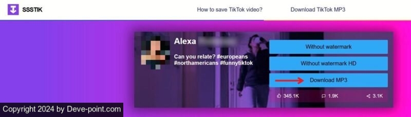 يمكنك أيضًا اختيار تنزيل الفيديو كملف MP3. إذا قمت بتحويل مقاطع فيديو TikTok الخاصة بك من MP4 الافتراضي إلى MP3، فسيكون لديك ملفات أصغر ومساحة تخزين أكبر على جهازك.