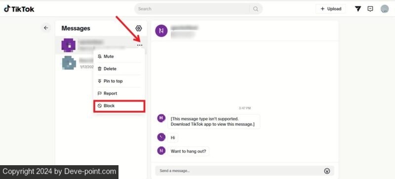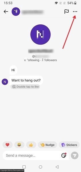 يمكنك أيضًا حظر شخص ما من خلال الرسائل المباشرة. ومع ذلك، لاحظ أنه لا يمكنك مراسلة شخص ما على TikTok إلا إذا كنتما تتابعان بعضكما البعض. افتح الرسالة، ثم اضغط على النقاط الثلاث في الزاوية اليمنى العليا.