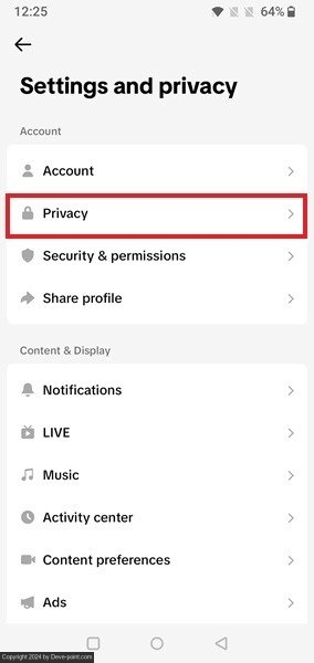 يختار الإعدادات والخصوصية، ثم اضغط على خصوصية.