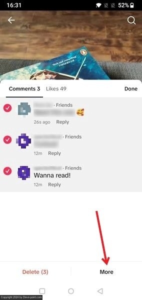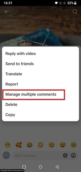 افتح قسم التعليقات لمقطع على TikTok. اضغط لفترة طويلة على التعليق، ثم اختر إدارة تعليقات متعددة.