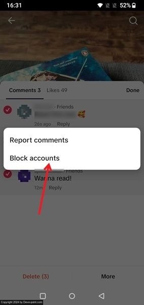 حدد التعليقات من الحسابات التي تريد حظرها، ثم انقر فوق أكثر.