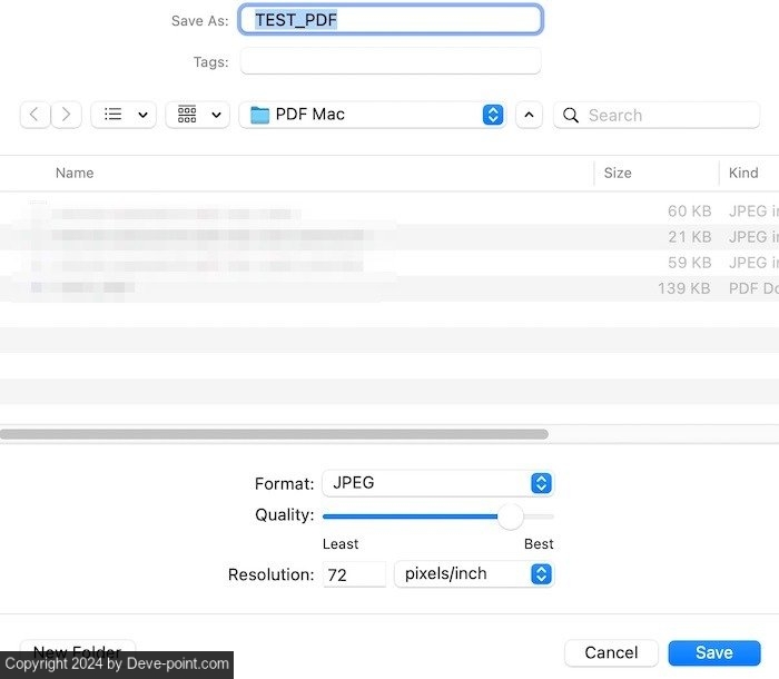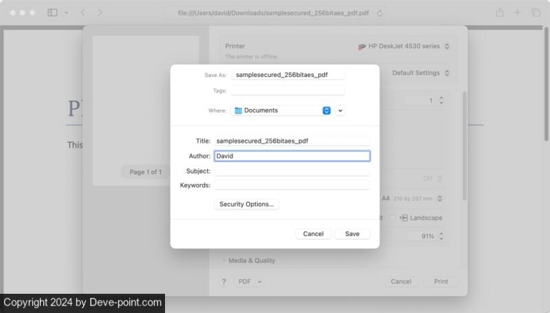 اضغط على ملف القائمة، تليها يحفظ… وبدلاً من ذلك، اضغط على مفاتيح الاختصار يأمر + س. احفظ ملف PDF الخاص بك كمستند جديد، وأعد تسميته حتى لا تخلط بينه وبين الإصدار المحمي بكلمة مرور. تسمح لك هذه الخطوة أيضًا باختيار موقع جديد لملف PDF غير المحمي الآن – مثل مجلد التنزيلات أو في مكان ما في iCloud للوصول إليه بسرعة في المستقبل.