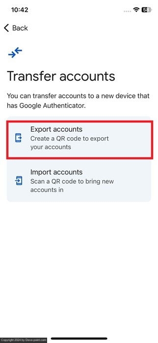 ملحوظة: كن حذرًا، لا تحذف تطبيق Google Authenticator على جهازك القديم دون اختيار الحذف أولاً تصدير الحساباتقد يؤدي ذلك إلى فقدان رموزك، مما قد يؤدي إلى عدم القدرة على الوصول إلى حساباتك. اجعل الأمر أسهل على نفسك، من خلال التأكد من أنك قمت بتغطية هذا الجزء.