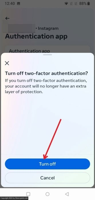 سيسألك Instagram الآن عما إذا كنت ترغب في تعطيل 2FA. انقر فوق أطفأ لاستكمال.