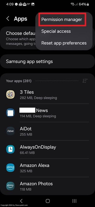 إذا كنت تريد رؤية كل تطبيق لديه إمكانية الوصول إلى الموقع في وقت واحد، فافتح مدير الأذونات بدلاً من ذلك. افتح إعدادات على جهازك. اضغط على تطبيقات ثم انقر على قائمة النقاط الثلاث في أعلى اليمين. حدد مدير الأذونات. وبدلا من ذلك، يمكنك الذهاب إلى إعدادات -> الأمان والخصوصية -> مدير الأذونات.