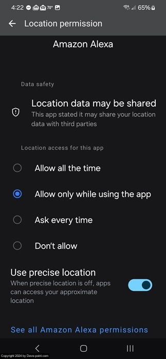 - السماح فقط أثناء استخدام التطبيق – لا تتمكن التطبيقات من الوصول إلى موقعك إلا عندما يكون التطبيق نفسه مفتوحًا