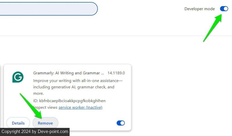 تمكين وضع المطور قم بالتبديل في الزاوية اليمنى العليا ثم انقر فوق يزيلسيسمح لك وضع المطور برؤية يزيل الخيار إذا لم يكن ظاهرًا. في بعض الحالات، قد يتعين عليك فتح ملف الامتداد تفاصيل الصفحة وانقر على يزيل هناك.