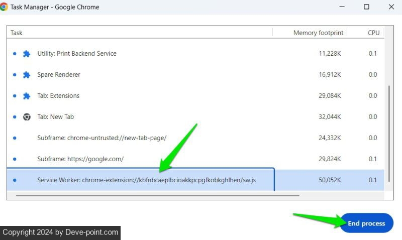 الآن اضغط على يحول + خروج مفاتيح لفتح مدير المهام في Chrome. حدد العملية التي تحمل معرف الامتداد هذا وانقر فوق إنهاء العملية لإيقافه. كرر هذه العملية لجميع العمليات التي تحمل معرف الامتداد، ثم حاول إزالة الامتداد.