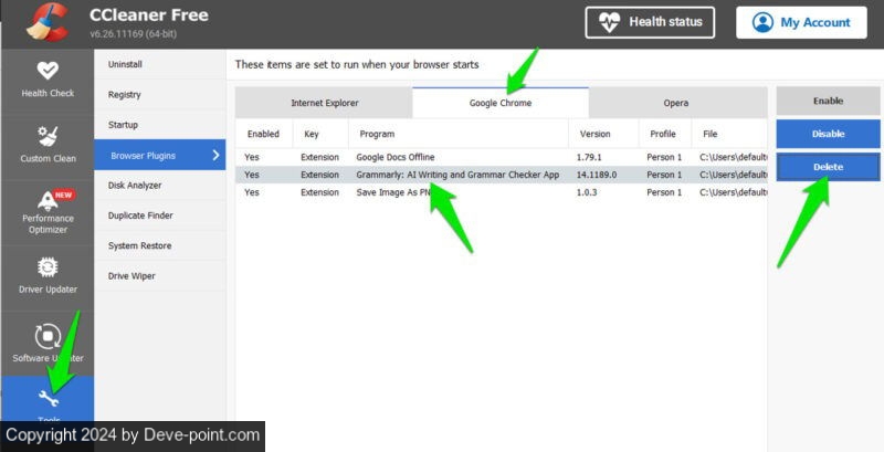 يمكنه أيضًا إلغاء تثبيت ملحقات Chrome. قم بتشغيل التطبيق وانتقل إلى أدوات -> إضافات المتصفح. حدد الامتداد الموجود أسفل جوجل كروم علامة التبويب وانقر على يمسح لإلغاء تثبيته.