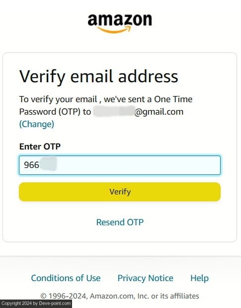 ستقوم أمازون بالتحقق من حسابك عن طريق إرسال كلمة مرور لمرة واحدة (OTP) إليك، والتي ستتلقاها إما في بريدك الإلكتروني أو على هاتفك. اكتب كلمة المرور لمرة واحدة (OTP) على صفحة أمازون للمتابعة.