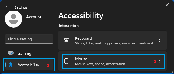 انتقل إلى الإعدادات > إمكانية الوصول > قم بالتمرير لأسفل في الجزء الأيمن وانقر فوق علامة التبويب " الماوس " الموجودة ضمن قسم "التفاعل".
