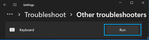 انتقل إلى الإعدادات > النظام (الجزء الأيمن)> استكشاف الأخطاء وإصلاحها (الجزء الأيمن)> مستكشفات الأخطاء ومصلحاتها الأخرى (الجزء الأيمن)> قم بالتمرير لأسفل في الجزء الأيمن وانقر فوق الزر تشغيل الموجود بجوار لوحة المفاتيح .