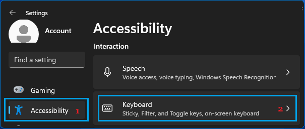 انتقل إلى الإعدادات > إمكانية الوصول > قم بالتمرير لأسفل في الجزء الأيمن وانقر فوق علامة التبويب لوحة المفاتيح الموجودة ضمن قسم "التفاعل".