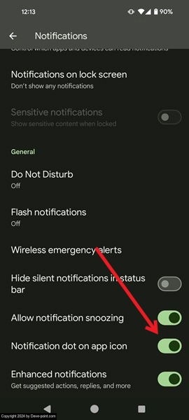 يمكن أن تضع الإشعارات الفورية أيضًا نقطة أعلى أيقونة التطبيق على شاشة Android للإشارة إلى وجود تنبيهات جديدة للتطبيق. إذا كنت تريد التأكد من تشغيل هذه الميزة، فارجع إلى الإعدادات -> الإشعارات.