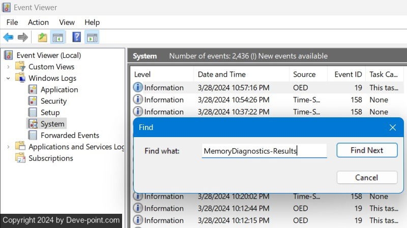 بمجرد إعادة تشغيل جهاز الكمبيوتر الخاص بك، افتح تطبيق Event Viewer، وانتقل إلى عارض الأحداث (محلي) -> سجلات الويندوز -> نظامانقر بزر الماوس الأيمن لفتح يجد القائمة، واكتب “MemoryDiagnostics-Results”. سيشير الناتج إلى أي أخطاء في الذاكرة ومدى أداء ذاكرة الوصول العشوائي (RAM) لديك بشكل جيد أو سيئ.