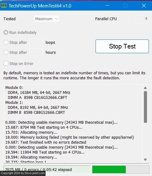 تُعد أداة تقييم ذاكرة الوصول العشوائي (RAM) من أفضل أدوات تقييم ذاكرة الوصول العشوائي لمستخدمي Windows على نظام 64 بت. فهي سهلة التثبيت ومجانية تمامًا. انقر فوق بدء الاختبارمن المستحسن اختبار أداء ذاكرة الوصول العشوائي (RAM) الخاصة بك عند أعلى قيم لها، لذا يجب عليك اختيار تم اختباره القيمة كـ أقصى، التي ينبغي تشغيل إلى أجل غير مسمى.بعد تشغيل الاختبار لبضع دقائق، انقر فوق إيقاف الاختباريمكنك رؤية الثواني المنقضية في العمود الأيسر. تقوم الأداة بإجراء مجموعة متنوعة من اختبارات أداء ذاكرة الوصول العشوائي (RAM) من خلال تحميل أنماط اختبار العينة. إذا كانت هناك أي أخطاء، فسوف تعرضها.