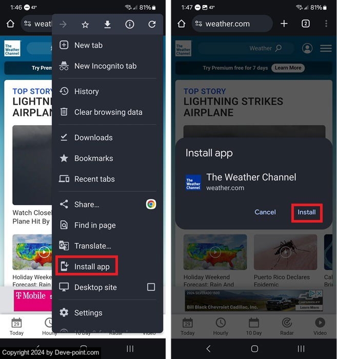 داخل Chrome أو متصفح قائم على Chromium، انقر فوق القائمة ذات النقاط الثلاث، وحدد ثَبَّتَ أو تثبيت التطبيق. افعل هذا بدلاً من أضف إلى الشاشة الرئيسية. مقبض ثَبَّتَ لإضافة تطبيق PWA إلى الشاشة الرئيسية لجهاز Android الخاص بك.