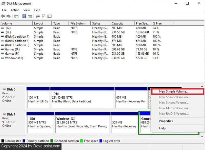 انقر بزر الماوس الأيمن على SSD، ثم حدد تهيئة القرص. يختار جي بي تي عند مطالبتك بتحديد نمط التقسيم، حدد نعمبمجرد اكتمال عملية التهيئة، انقر بزر الماوس الأيمن فوق المساحة غير المخصصة، وحدد مجلد بسيط جديداتبع الإرشادات التي تظهر على الشاشة لتعيين وحدة تخزين SSD وحرف محرك الأقراص.
