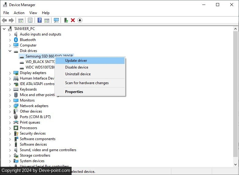 وبالمثل، قم بالتوسيع محركات الأقراصانقر بزر الماوس الأيمن فوق SSD، ثم قم بتحديث برامج التشغيل باستخدام الخطوات الموضحة لوحدة التحكم في التخزين.
