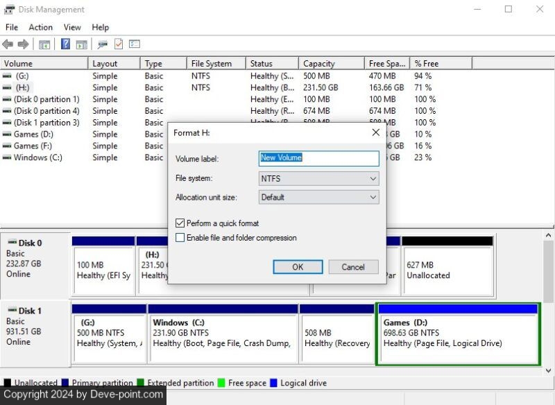 بمجرد إجراء نسخة احتياطية لأي بيانات تريد الاحتفاظ بها، انتقل إلى إدارة الأقراص مرة أخرى، وانقر بزر الماوس الأيمن فوق SSD، ثم انقر فوق شكل. قم بتسمية محرك الأقراص، وحدد نظام الملفات. (يعمل نظام NTFS بشكل رائع مع معظم الأشخاص.) اختر حجم التخصيص الافتراضي، ثم حدد المربع بجوار تنسيق سريع، و اضغط نعم لبدء العملية.