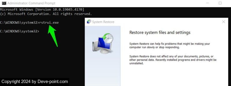 rstrui.exe و اضغط يدخل لبدء استعادة النظام.