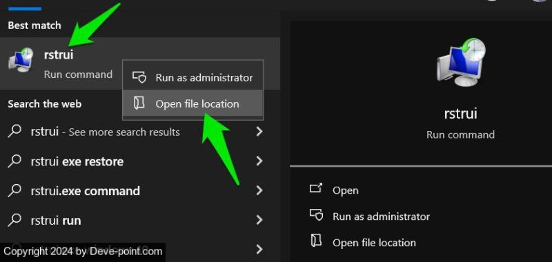 rstrui في بحث Windows، انقر بزر الماوس الأيمن فوق أيقونة استعادة النظام وحدد افتح مكان ملف.