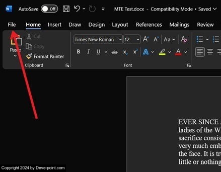 افتح مستند Word الذي تريد تصديره إلى تنسيق PDF على جهازك. انقر فوق ملف في الزاوية اليسرى العليا.
