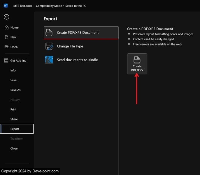 اذهب إلى يصدّر في الشريط الجانبي، انقر على إنشاء مستند PDF/XPS، ثم إنشاء PDF/XPS زر.