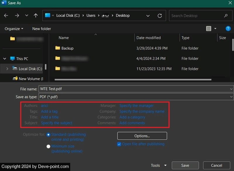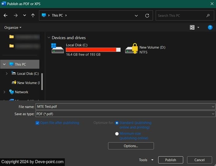 اكتب اسم الملف الخاص بملف PDF الخاص بك، واختر مجلد الحفظ، ثم انقر فوق ينشر.