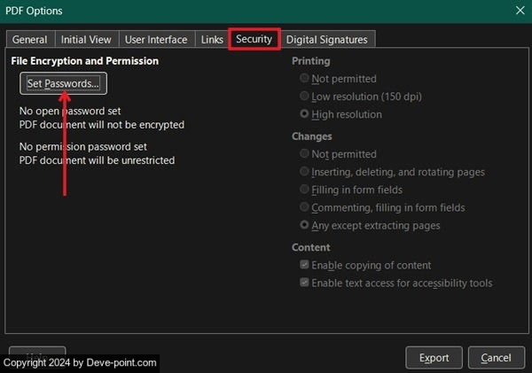 إذا كنت تريد حماية ملف PDF الناتج، فانتقل إلى حماية علامة التبويب، وانقر على تعيين كلمات المرور.