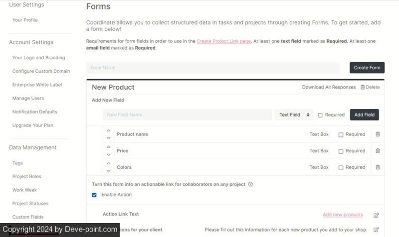 لإعطاء مثال لكيفية تحسين سير عملك باستخدام CoordinateHQ، لنفترض أنك تعيد تصميم بوابة الويب الخاصة بعميلك وتحتاج إلى معرفة كل مرة يدخل فيها منتج جديد إلى متجره الإلكتروني. لن يضطر عميلك إلى إرسال بريد إلكتروني منفصل إليك في كل مرة يظهر فيها منتج جديد في توزيعه. بدلاً من ذلك، يمكنك إنشاء نموذج في CoordinateHQ عبر الإعدادات. في إدارة البيانات، انتقل إلى نماذج، وأضف حقول المعلومات المطلوبة إلى النموذج. على سبيل المثال، اسم المنتج و سعر.