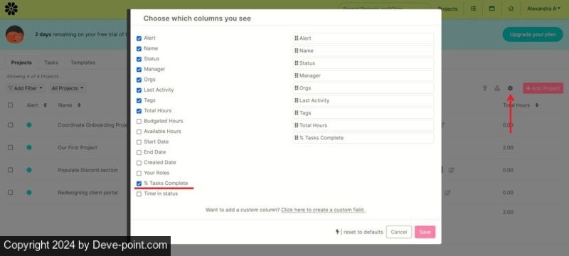 عند العودة إلى عرض المشروعات والنقر فوق رمز الترس، يجب أن ترى خيار إضافة مربع الاختيار إلى الجدول.