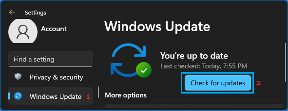 انتقل إلى الإعدادات > انقر فوق Windows Update في الجزء الأيمن. في الجزء الأيمن ، انقر فوق الزر التحقق من وجود تحديثات .