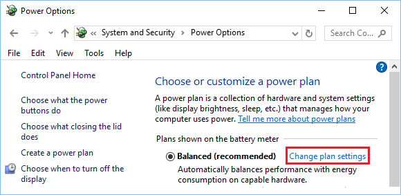 في شاشة خيارات الطاقة ، انقر فوق الارتباط تغيير إعدادات الخطة الموجود بجوار خطة الطاقة الحالية.