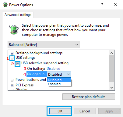 في شاشة خيارات الطاقة ، انقر فوق إعدادات USB > إعداد التعليق الانتقائي لـ USB وحدد الخيار المعطل لـ "متصل بالتيار الكهربائي" وأيضًا لـ "على البطارية" (إذا كنت تستخدم كمبيوتر محمول).