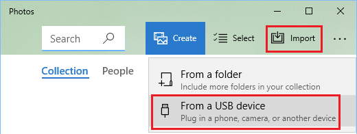 1. قم بتوصيل هاتف Android الخاص بك بالكمبيوتر > افتح تطبيق Microsoft Photos > انقر فوق أيقونة الاستيراد وحدد خيار من جهاز USB .