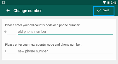 3. في الشاشة التالية ، أدخل رقم هاتفك القديم في المربع الأول ورقم الهاتف الجديد في المربع الثاني وانقر على تم .