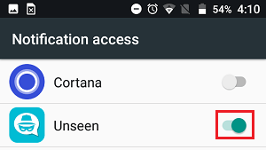 في الشاشة التالية (شاشة الوصول إلى الإشعارات) ، قم بتزويد تطبيق Unseen بإمكانية الوصول إلى الإشعارات عن طريق تحريك زر التبديل بجوار وضع Unseen إلى وضع التشغيل ON .