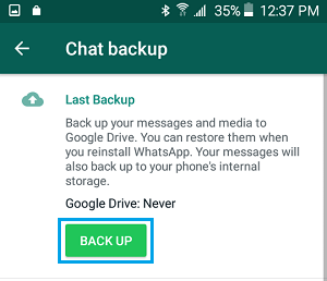 4. في الشاشة التالية ، انقر فوق زر النسخ الاحتياطي لبدء عملية إنشاء WhatsApp Backup يدويًا على هاتفك المحمول.