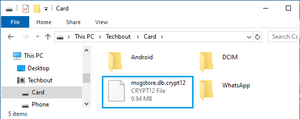 7. على جهاز الكمبيوتر الخاص بك ، انتقل إلى الهاتف > البطاقة / الجهاز وانسخ ملف msgstore.db.crypt12 إلى سطح المكتب.