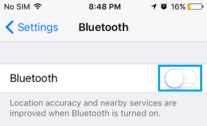 إذا كنت تواجه صوتًا متقطعًا أو متأخرًا في خرائط Google ، فقد تكون المشكلة بسبب انقطاع الشبكة الخلوية على جهازك عن طريق البلوتوث.انتقل إلى الإعدادات > Bluetooth > قم بإيقاف تشغيل Bluetooth عن طريق تحريك مفتاح التبديل إلى وضع إيقاف التشغيل .