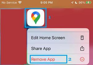 اضغط لفترة طويلة (اضغط مع الاستمرار) على تطبيق خرائط Google وحدد خيار إزالة التطبيق .
