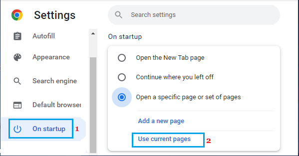 في شاشة الإعدادات ، حدد بدء التشغيل في الجزء الأيمن. في الجزء الأيمن ، انقر فوق خيار استخدام الصفحات الحالية .