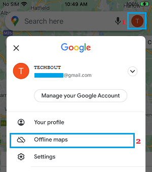 كما ذكرنا أعلاه ، فإن الخطوة الأولى هي تنزيل خريطة المنطقة التي تهتم بها على هاتف Android الخاص بك.1. افتح خرائط Google > اضغط على أيقونة حسابك وحدد خيار الخرائط بلا اتصال بالإنترنت .
