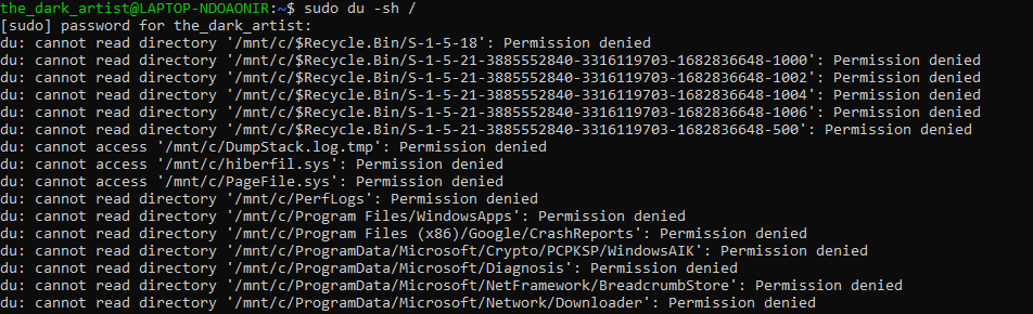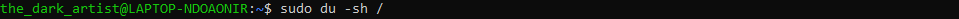- لنبدأ بأمر du. يمكن أن يكون إخراجها طويلًا ومرهقًا ، لذلك سنستخدم علامتي -s و -h. يلخص -s النتائج ، بينما يضمن -h أنه مقروء من قبل الإنسان. لذا أدخل الأمر sudo du -sh / where / يشير إلى الدليل الأساسي.