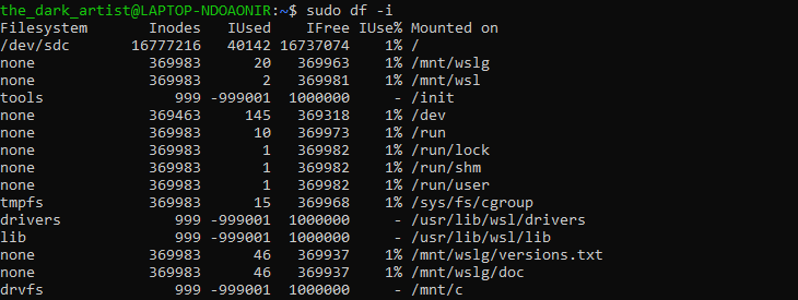 سيوضح هذا العدد الإجمالي لملفات inodes الموجودة في نظام الملفات ، إلى جانب الكمية المستخدمة حاليًا. إذا لم يكن هناك إيداعات حرة متبقية على نظامك ، فهذا هو مصدر الخطأ "لا توجد مساحة على الجهاز".