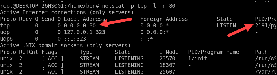 على سبيل المثال ، لمعرفة عمليات TCP التي يتم الاستماع إليها على المنفذ 80 ، يمكنك تشغيل: