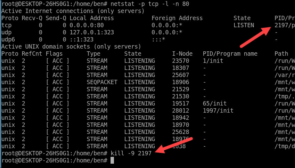 في هذا المثال ، يمكن أن يكون البروتوكول هو tcp أو udp ، بينما المنفذ هو رقم المنفذ الذي تريد التحقق منه. على سبيل المثال ، لمعرفة العمليات التي تستخدم منفذ TCP 80 ، يمكنك تشغيل: